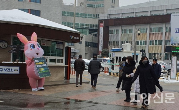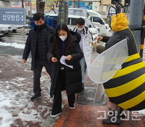[고양신문] 고양시청 정문 앞과 큰길가에 귀여운 상어와 토끼, 꿀벌, 펭귄이 출몰했다. 20일부터 22일까지 점심시간에 맞춰 나타난 동물 인형들은 추운 날씨에도 연신 손을 흔들고 전단지를 나눠주며 정문을 출입하는 공무원들과 거리를 지나는 시민들의 눈길을 한몸에 모았다.