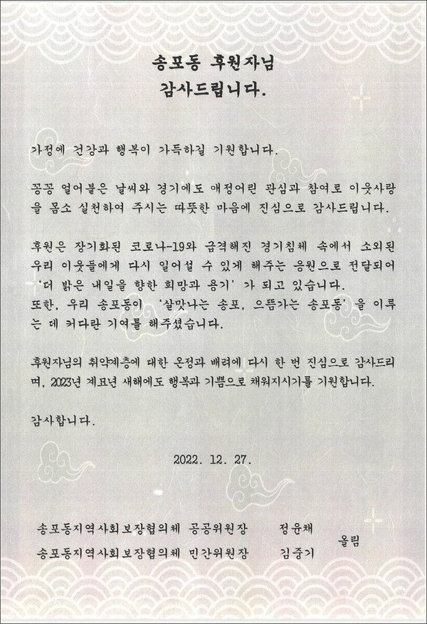 김중기 송포동 지역사회보장협의체 위원장은 “사회와 경제적으로 어려운 요즘이지만 살맛 나는 송포동을 위해 관심을 가져주시는 후원자들에게 늘 감사한 마음이다. 새해에는 더 많은 우리 이웃들의 눈물과 아픔을 보듬어가겠다”라고 전했다.