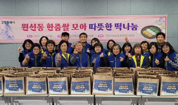 원신동 지역사회보장협의체(장동규 위원장)가 지난 12월 27일 삼송동 종합복지회관이 함께 협력해 ‘한줌 쌀모아 따뜻한 떡나눔’ 사업을 추진했다. 이번 행사는 지역사회보장협의체를 중심으로 한 지역 주민들이 십시일반 쌀 모으기 사업에 참여했고, 총 500kg의 쌀을 후원받아 연말연시 소외된 이웃 100세대에 따뜻한 떡국떡과 호박설기를 만들어 전달했다.