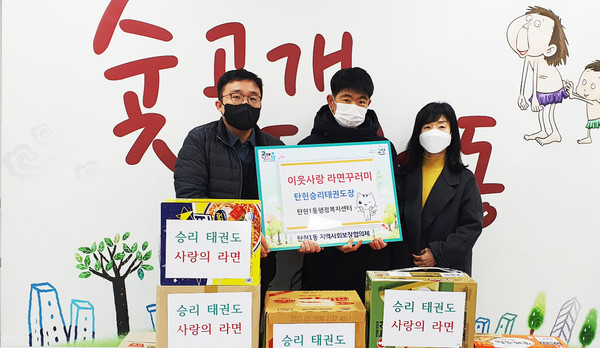승리태권도장이 추운 겨울 어려운 이웃들에게 나누어 달라며 1월 2일 ‘사랑의 라면’ 553개를 탄현1동 행정복지센터에 기탁했다. 승리태권도는 교사와 학생들이 어려운 이웃에 대한 나눔교육 실천을 위해 2019년 ‘사랑의 라면’ 기부를 시작으로 4년째 나눔을 실천하고 있다.