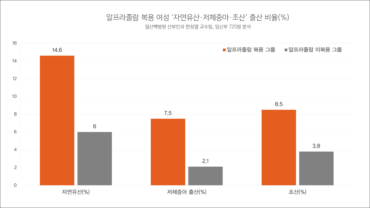 분석결과 알프라졸람 복용 그룹의 자연유산 비율은 14.6%(14명)로 미복용 그룹(6.0%)보다 8.6%포인트 더 높았다. 저체중아 출산비율도 7.5%로, 미복용 그룹(2.1%)보다 5.4%포인트 더 높았다. 임신 37주 이전에 분만하는 조산율도 알프라졸람 복용 그룹이 8.5%로, 미복용 그룹(3.8%)보다 4.7%포인트 높았다.