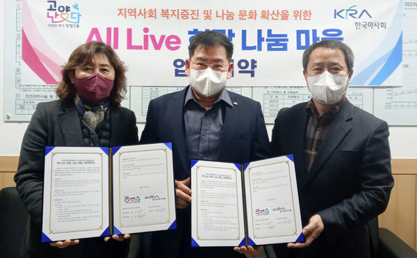 장항2동 지역사회보장협의체(공공위원장 박인석·민간위원장 이승희)가 지난 1월 13일 한국마사회 일산지사(지사장 이남용)와 ‘All Live 희망 나눔 마을’ 업무협약을 체결했다. 장항2동 지역사회보장협의체는 지역 내 취약계층의 복지증진사업 실시에 필요한 재원을 마련하기 위해 한국마사회 일산지사 건물 2층~7층에 마권 잔액 모금함을 설치하기로 협약했다.