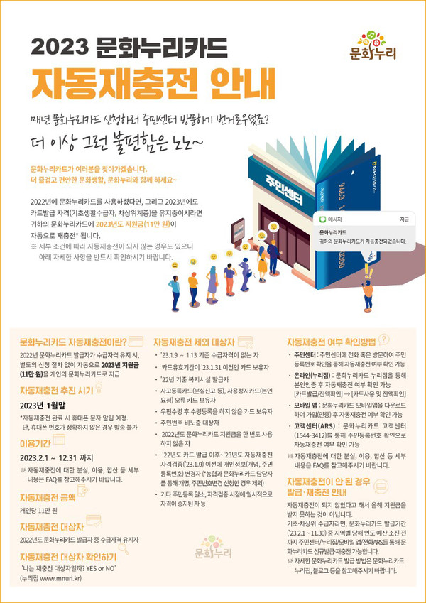 자동재충전은 2022년 문화누리카드 발급자가 수급자격을 유지할 시, 2023년 지원금 11만 원이 별도의 신청 절차 없이 자동으로 개인의 문화누리카드로 지급된다. 충전된 카드는 올해 2월 1일부터 12월 31일까지 사용이 가능하다. 자동재충전이 되지 않은 기초·차상위수급자일 경우 2월 1일 이후 ▲동 행정복지센터 ▲누리집 ▲모바일앱 ▲전화ARS로 문화누리카드를 신규발급 혹은 재충전할 수 있다.