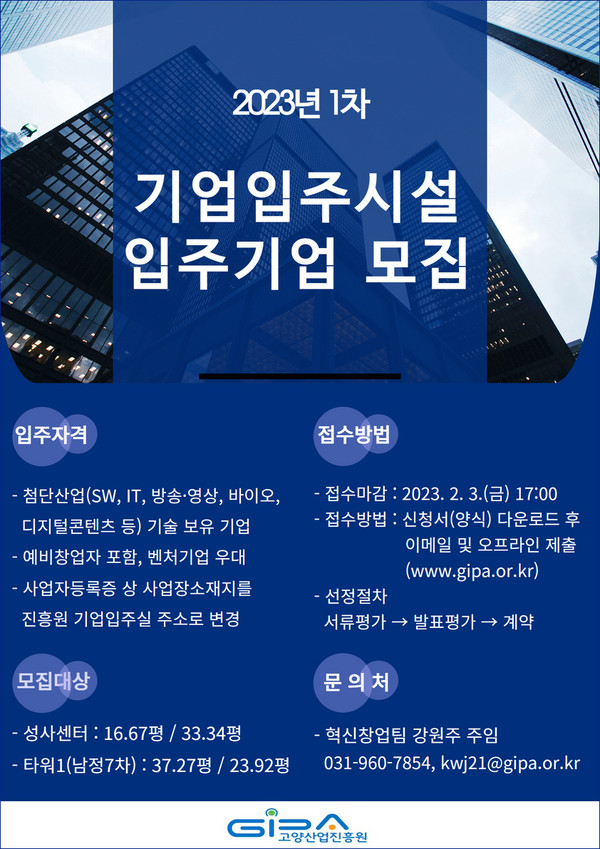고양산업진흥원(이하‘진흥원’)이 운영하는 기업입주시설에서 2월 3일까지 신규 입주기업을 모집한다. 모집 규모는 총 4개실로 성사센터 2개실(16.67평, 33.34평·덕양구 성사동 소재), 타워1(남정7차) 2개실(37.27평, 23.92평·일산동구 장항동 소재)이며, 입주 대상은 방송·영상과 디지털콘텐츠, 지식서비스(S/W, IT) 분야의 기업과 예비창업자이다.
