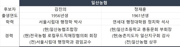 [고양신문] 오는 3월 8일 치러지는 일산농협 조합장 선거는 3선에 도전하는 김진의 조합장의 아성에 정재훈 전 상무가 도전장을 내미는 형국이다. 조합장으로 재임했던 지난 8년 동안 괄목할 만한 성과를 보여준 김진의 조합장은 전국농협 로컬푸드직매장협의회 회장으로도 활약하고 있다. 김 조합장은 “초심을 잃지 않겠다. 경영활성화를 통해 순이익을 증대시키고 배당금과 환원사업을 확충하겠다”는 의욕을 내비쳤다.