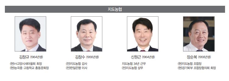 김창수 전 감사는 젊은 시절부터 쌓은 금융맨 커리어를 바탕으로 “지도농협 신경영 도입을 통해 경제변화에 대응하고 수익창출을 도모하겠다”며 지지를 호소했다. 마지막으로 신원근 전 상무는 88년부터 무려 34년간 지도농협에 몸담아온 경력을 강조하며 “청렴함과 실무능력을 바탕으로 조합원들의 실익과 행복을 추구하는 신뢰받는 지도농협을 만들겠다”고 이야기했다. (가나다 순)