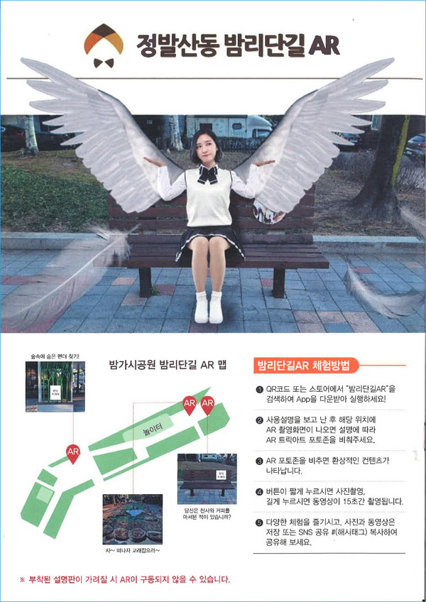 정발산동 주민자치회가 관광특화거리 사업의 일환으로 밤가시 제2공원에 증강현실 포토존 세 곳을 설치했다고 1일 밝혔다. 세 곳의 포토존이 설치된 밤가시 제2공원을 방문해 스마트폰에 플레이스토어를 통해 밤리단길AR앱을 설치한 후, 지정된 위치에서 사진을 찍으면 ▲숲속에 숨은 판다 찾기 ▲연못 속에 있는 고래 만나기▲벤치에서 천사와 함께 커피 마시기 등을 경험할 수 있다.