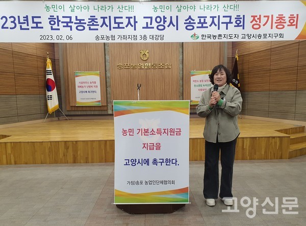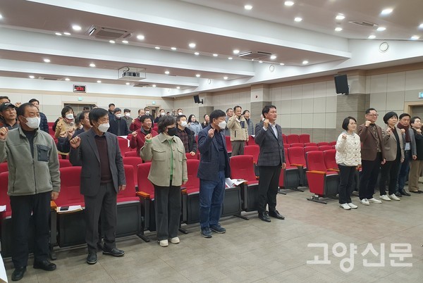 회의에 앞서 임용식 조합장의 구호에 맞추어 참석자들은 “농민기본소득 지원금 지급을 고양시에 촉구한다. 시설하우스 농작물 재배농가 난방비 지원 고양시에 촉구한다. 저탄소 농업실천으로 탄소중립 녹색성장 이뤄내자” 등의 구호를 힘차게 외쳤다.