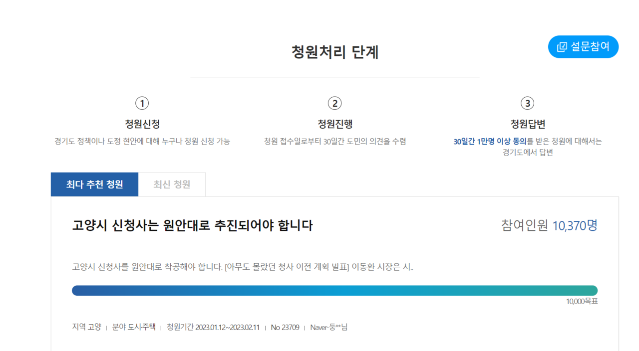 고양시 신청사 덕양존치추진위원회(이하 존치위)에 따르면 지난 1월 12일 ‘고양시 신청사는 원안대로 추진되어야 합니다’라는 제목으로 작성된 도민청원 게시물이 7일 오전 1만 명을 넘었다. 해당 청원제도는 경기도가 주요정책 및 현안에 대해 도민의 자유로운 참여를 촉진시키기 위해 마련된 소통창구로서 30일 동안 1만명 이상의 동의를 받을 경우 해당 사안에 대해 경기도가 직접 답변하고 정책반영을 검토하도록 되어 있다.