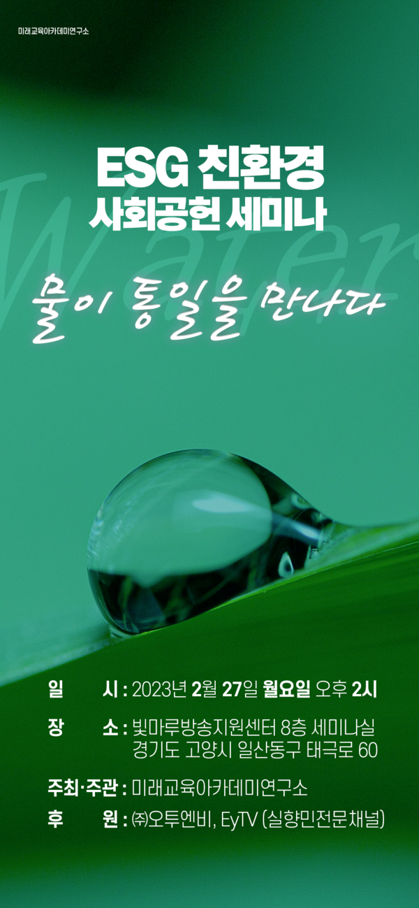 미래교육아카데미연구소가 2023년 연중 기획으로 ESG(기업의 비재무적 요소인 환경Environment·사회Social·지배구조 Governance) 친환경 사회공헌을 위한 세미나를 연다. 이번 세미나는 ESG개념 확산과 바람직한 생태계 조성을 위한 것으로, 2월 27일(월) 오후 2시 빛마루방송지원센터(일산동구 장항1동) 8층 세미나실에서 열린다. ‘물(water)이 통일을 만나다’라는 주제로 열리는 세미나에서는 북한 물 환경 보호와 개선 방안, 남북한 협력방안 등을 논의한다.