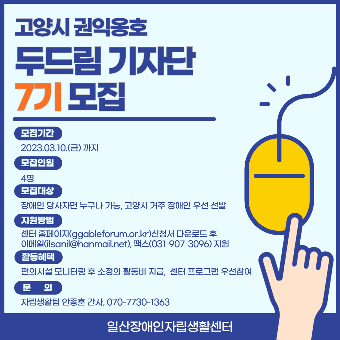 [고양신문] 일산장애인자립생활센터(대표 김재룡)가 지역사회 장애인의 완전한 사회참여 실현을 목적으로 하는 고양시 권익옹호 기자단 ‘두드림 7기’ 단원을 다음달 10일(금)까지 모집한다.
