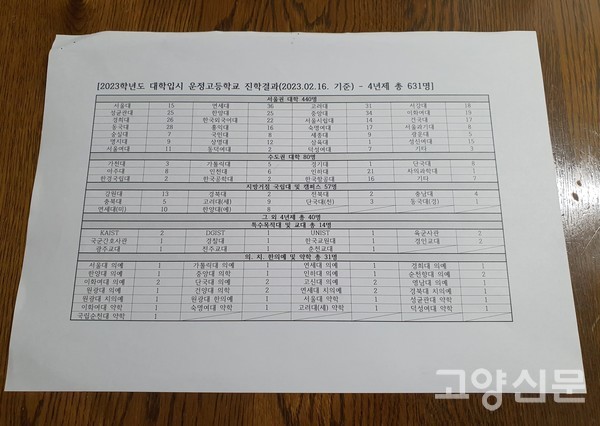 3학년 9반뿐만 아니라 운정고는 2월 16일 기준으로 4년제 대학에 총 631명이 합격했고, 서울수도권에만 440명이 합격의 영광을 안았다. 피 교장은 “대학 입시라는 어려운 관문을 통과해준 학생들이 기특하다”고 했다.
