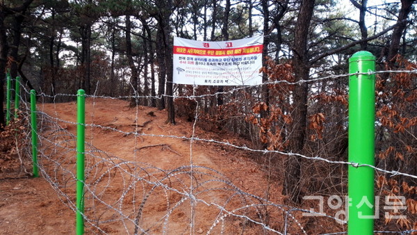 [고양신문] 탄현마을과 중산마을 주민들의 큰 사랑을 받던 황룡산 숲길 산책로가 하루아침에 가시철조망에 가로막혔다. 이달 중순 황룡산 능선 중심부에서 시작해 동쪽 경사면 대부분을 차지하는 산림(성석동 산203번지)의 땅 주인(전주이씨 000파 문중)이 사유지 경계를 따라 철조망 펜스를 친 것. 이로 인해 고봉동 삼거리에서 시작해 능선을 따라 군부대 앞 정상 부근까지 이어졌던 황룡산 주 산책로의 절반 이상이 폐쇄됐고, 탄현마을과 황룡산 동쪽 기슭 상감천(감내)마을을 이어주던 고양누리길 9코스 고봉누리길 황룡산 구간도 여지없이 단절됐다.