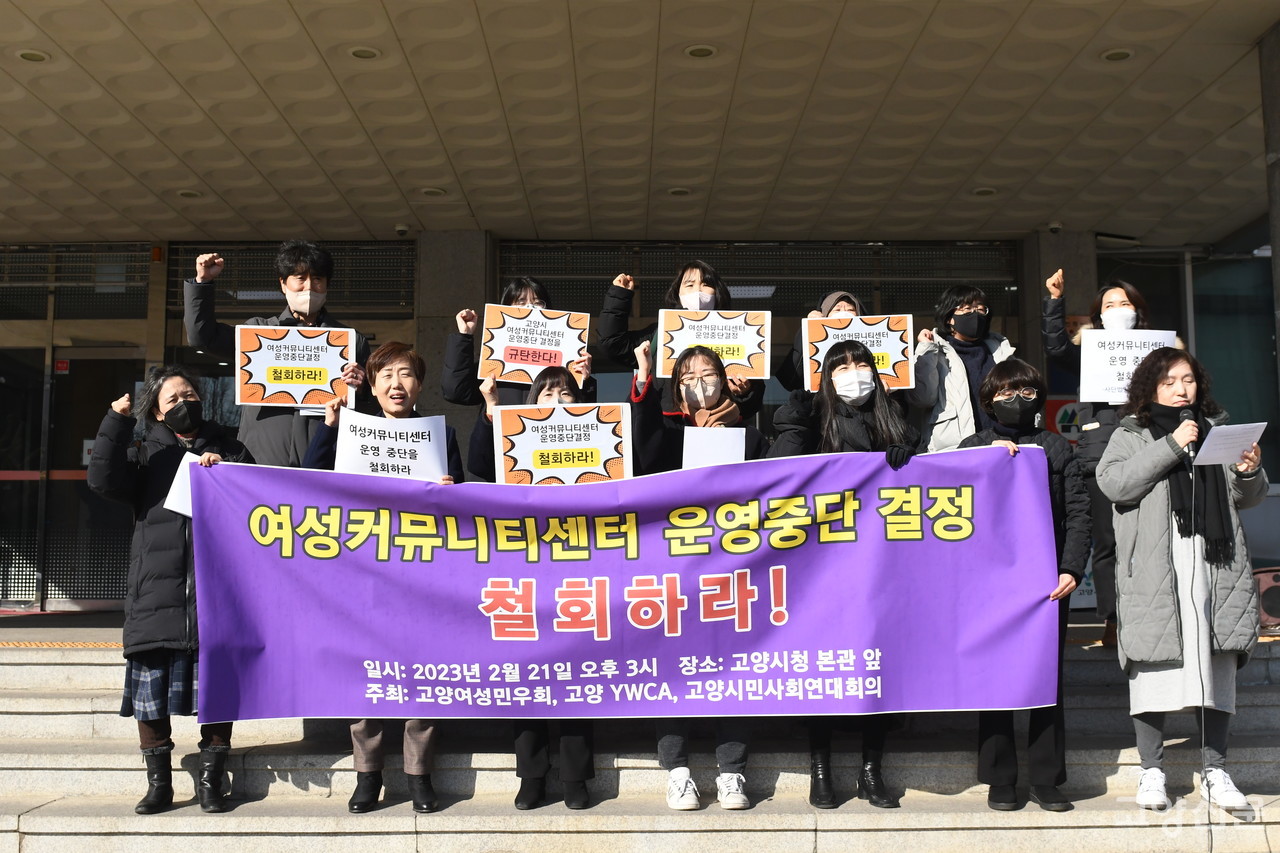이러한 가운데 지난 21일 고양여성민우회와 고양YWCA 등 23개 시민사회단체는 시청 앞에서 기자회견을 열고 여성커뮤니티센터 일방적 운영 중단 결정 철회를 촉구했다. 참석자들은 “오랜 세월 고양시와 고양시민이 함께 논의하고 각고의 노력 끝에 만들어진 여성커뮤니티 공간을 문을 닫는 이유가 시에서 운영하는 다른 센터를 이전하기 위함이라니 도저히 이해할 수도 없고 그 이유의 진실성도 의심하지 않을 수 없다”며 “작년부터 이어진 여성가족과를 가족정책과로 바꾸고 여성정책 부서를 해체하려는 등 일련의 시도와 맥락을 같이하는 행보가 아니냐”고 지적했다.