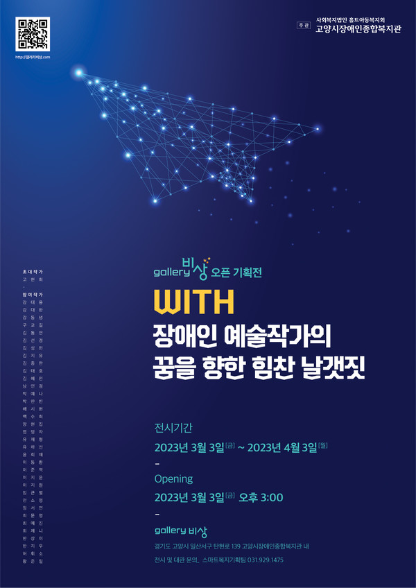갤러리 비상은 장애인 예술작가의 창작활동을 지원하고, 지역주민에게는 문화·예술 체험의 기회를 제공하고자 복지관 내 이동공간으로만 한정되어있던 경사로를 복합문화 예술공간으로 재탄생시켰다. 이번 전시회는 복지관 예술·문화 프로그램 아르떼아카데미와 장애·비장애인 통합프로젝트 WITH, 초청작가 고현희 작가의 작품이 전시된다.