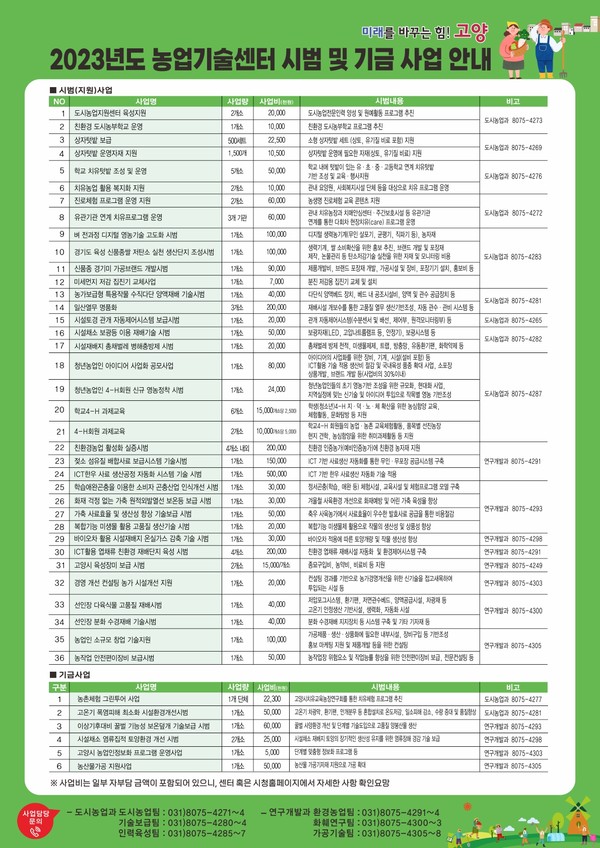 고양시농업기술센터가 농업인을 위해 다양한 시범 사업과 기금 사업을 운영한다. 농업기술센터는 1월부터 지원사업을 신청받고 있으며, 접수일을 3월 3일까지 연장했다. 2023년 농업기술센터가 운영하는 시범사업은 ▲친환경 도시농부학교 운영 ▲상자텃밭 보급·운영자재 지원 ▲학교 치유텃밭 조성 ▲청년 농업인 아이디어 사업화 공모사업 ▲농업인 소규모 창업 기술지원 등 36개 사업이다. 기금사업은 농촌체험 그린투어 사업과 폭염피해 최소화 시설환경개선, 농산물가공 지원 등 6개 사업이다.