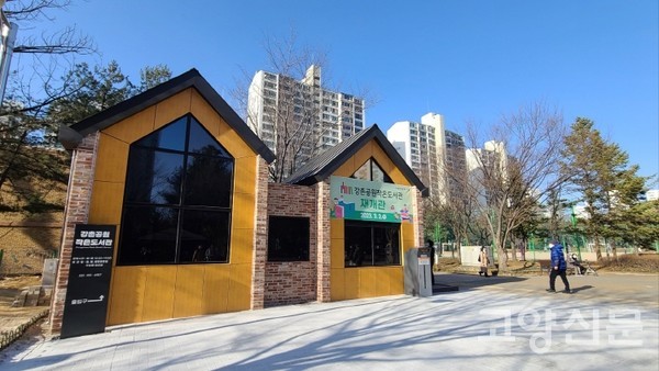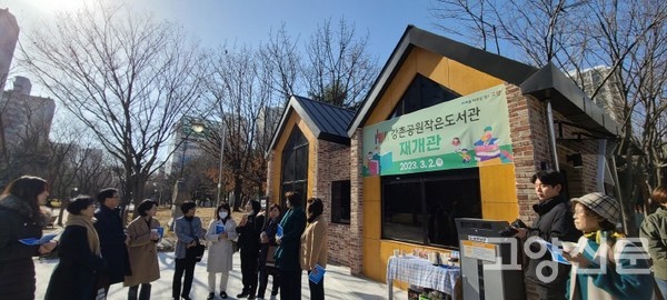 [고양신문] 지난해 6월부터 문을 닫았던 강촌공원 ‘5분 걸음 예쁜도서관’이 8개월간의 시설확장공사를 마치고 ‘강촌공원 작은도서관’이라는 이름으로 새롭게 문을 열었다. 2일 열린 재개관 행사에는 한창익 소장을 비롯한 고양시도서관센터 관계자와 다수의 고양시의원들이 참석해 강촌공원 작은도서관의 새출발을 함께 축하했고, 부모님의 손을 잡고 찾아온 꼬마 손님들로 첫날부터 도서관 안팎이 북적였다.