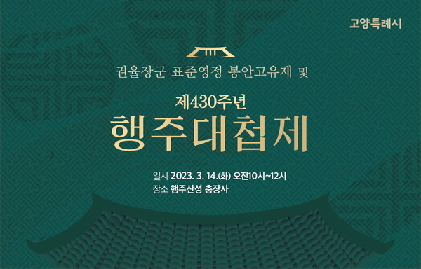 고양시가 올해로 제430주년을 맞는 행주대첩을 기념하는 행주대첩제를 오는 3월 14일(화) 오전 10시 행주산성 내 충장사에서 연다. 행주대첩제는 행주산성 전투를 승리로 이끈 충장공 권율 도원수와 애국선열들의 고귀한 넋을 추모하는 제례의식이다. 이번 행주대첩제는 권율 도원수의 표준영정이 행주산성 충장사에 모셔지는 것을 알리는 봉안고유제와 함께 열린다.