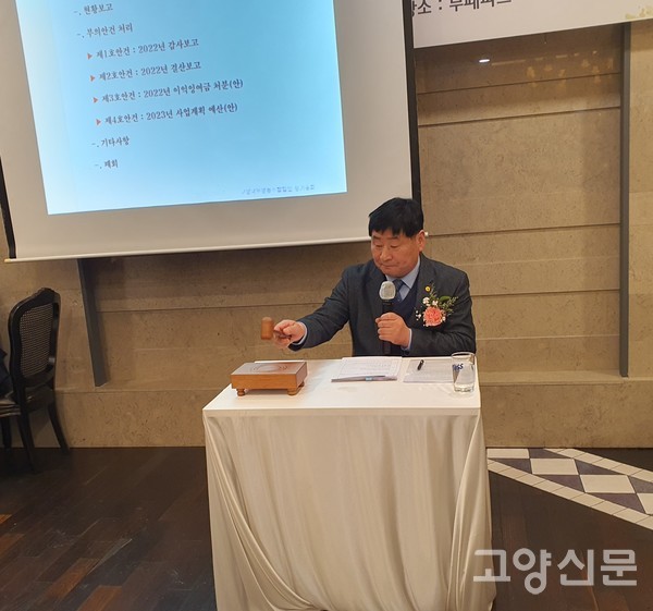 이날 총회는 우수조합원과 직원 시상식(감사패), 대표이사 인사말, 김덕용 초대회장과 조합원인 김보연 고양시산림조합장 격려사 등이 1부 순서였고, 성원과 현황보고, 부의안건 심의, 2022년 감사와 결산보고, 이익 잉여금 처분(안), 2023년 사업계획 예산(안) 심의 등으로 진행됐다.