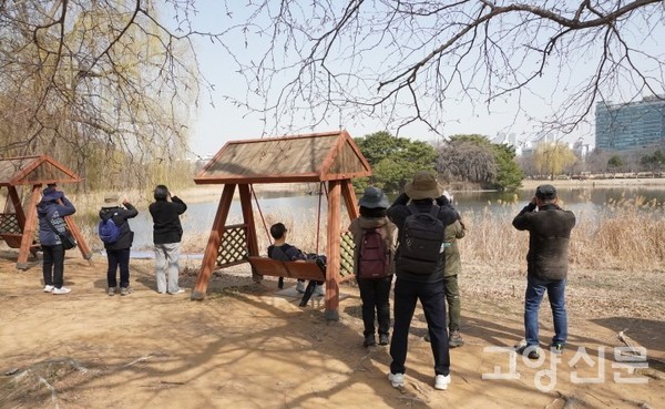 [고양신문] 고양에서 활동하는 탐조동아리 ‘새와사람사이’가 21일 일산호수공원에서 탐조 입문자들을 위한 교육프로그램 ‘맛탐즐탐(맛보기 탐조, 즐거운 탐조)’을 열었다. 아침 9시, 출발장소인 일산호수공원 자연학습센터 앞에 모인 12명의 초보 탐조인들에게 이날 행사의 진행을 맡은 새와사람사이 신은주 회장과 이혜영, 문경자 회원이 환영 인사를 건넨다.
