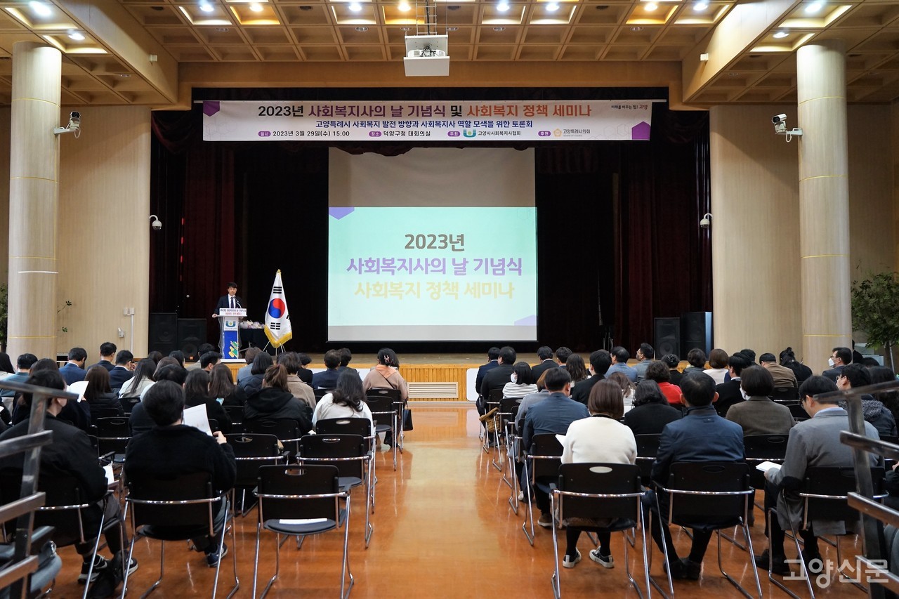 29일 덕양구청 대회의실에서 고양시사회복지협회에서 주최한 ‘2023년 사회복지사의 날 기념식 및 사회복지 정책세미나’가 열렸다. 이날 토론회는 황의철 고양시사회복지사협회 부회장/정책분과위원장이 사회를 맡았고, 고양시 사회복지사 150여 명과 조현숙 부의장, 고부미 문화복지위원 위원장, 최규진 문화복지위원회 부위원장, 이창원 고양시사회복지협의회장, 김신실 고양시사회복지사협회장 등이 참석했다.