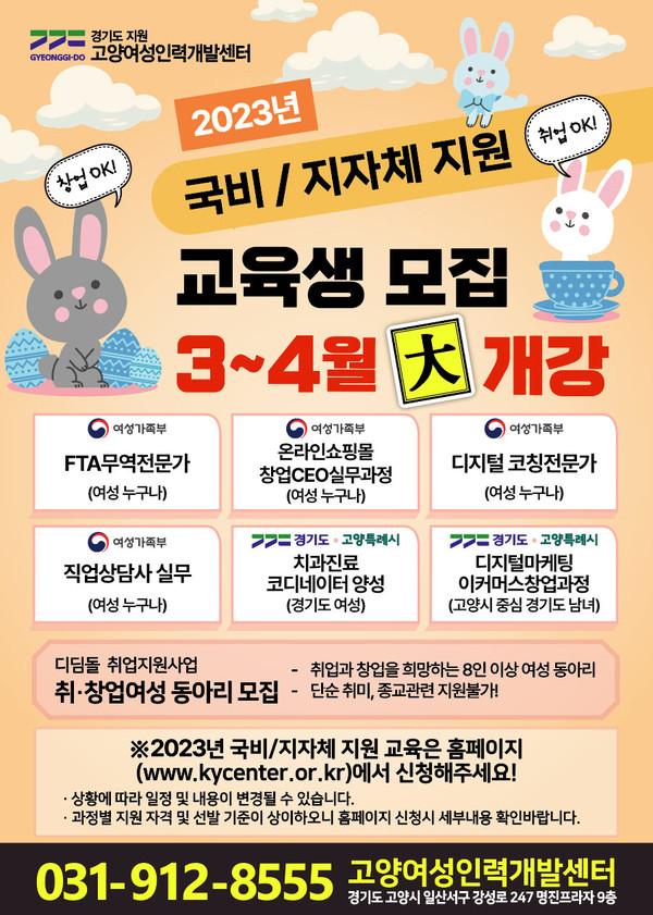 고양시와 고양여성인력개발센터가 청년·여성 구직자를 대상으로 2023년 상반기 대규모 국비지원 교육생을 모집한다. 고양여성인력개발센터는 원스톱 취·창업지원 기관으로 교육훈련과정 뿐만 아니라 미취업자의 경제활동지원을 위한 국민취업지원제도, 중장년여성취업 지원사업, 여성동아리육성 디딤돌사업 등 다양한 계층을 위한 취업지원 사업을 운영하고 있다.