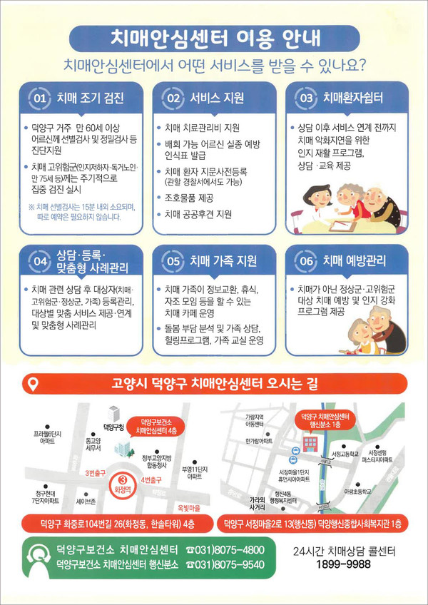 센터 관계자는 “치매 환자와 가족의 경제적 부담을 경감하고 치매 어르신들의 삶의 질을 향상하기 위해 노력하겠다”라고 전했다. 지원에 관한 문의는 덕양구보건소 치매안심센터(031-8075-4815, 4817)로 연락하면 된다.
