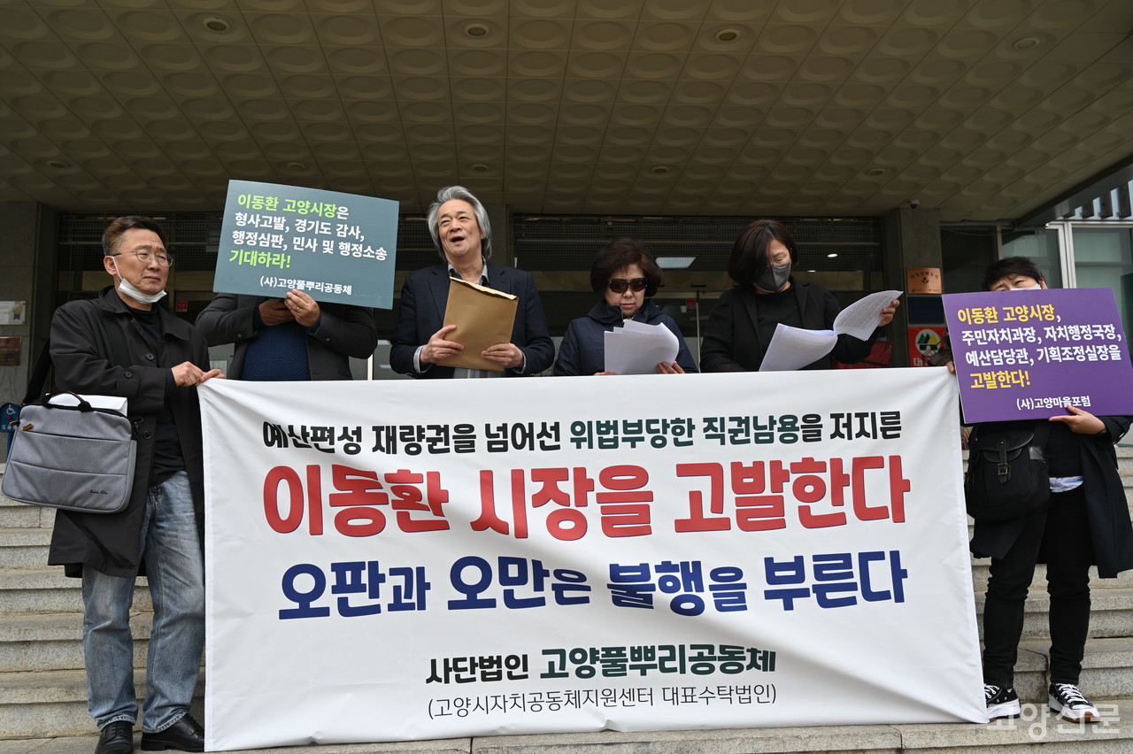 공동체센터 대표수탁단체인 (사)고양풀뿌리공동체는 13일 시청 앞 기자회견을 열고 이동환 시장을 비롯해 시 주민자치과장, 예산담당관 등 간부공무원 4명을 직권남용 및 직무유기 등의 혐의로 고양경찰서에 고발한다고 밝혔다. 올해 인건비 이하의 예산 편성으로 정상적인 과업수행을 불가능하게 만든 상황에서 1년 사업계획서 작성을 강요하고 협의조차 거부한 채 끝내 위수탁 계약 해지까지 통보했다는 것. 이는 시장과 시 집행부의 직권남용에 해당한다는 게 법인 측의 주장이다.