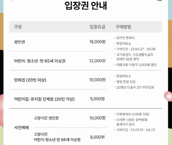 꽃박람회 티켓가격은 성인 1만5000원, 어린이·청소년·65세이상 1만2000원인데, 온라인 판매채널에서 사전예매하면 1만1000원, 9000원으로 할인된다. 고양시민은 고양시 곳곳에 마련된 133개소 지정예매처에서 4월 23일 전에 사전예매하면 1000원 더 할인된 1만원에 티켓을 살 수 잇다. 티켓을 현장 발권할 경우 교통카드로 결제하면 3000원 할인 혜택이 주어진다.
