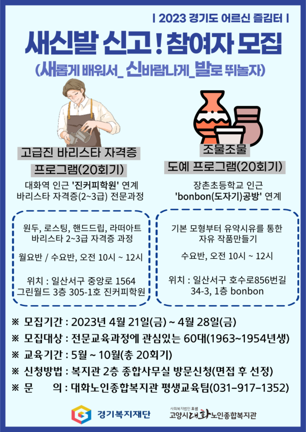 ‘어르신 즐김터’ 참여자는 4월 28일(금)까지 모집할 예정이며, 신청은 대화노인종합복지관에 직접 방문해 신청하면 된다. 문의는 고양시대화노인종합복지관 평생교육팀(031-917-1352)으로 하면 된다.
