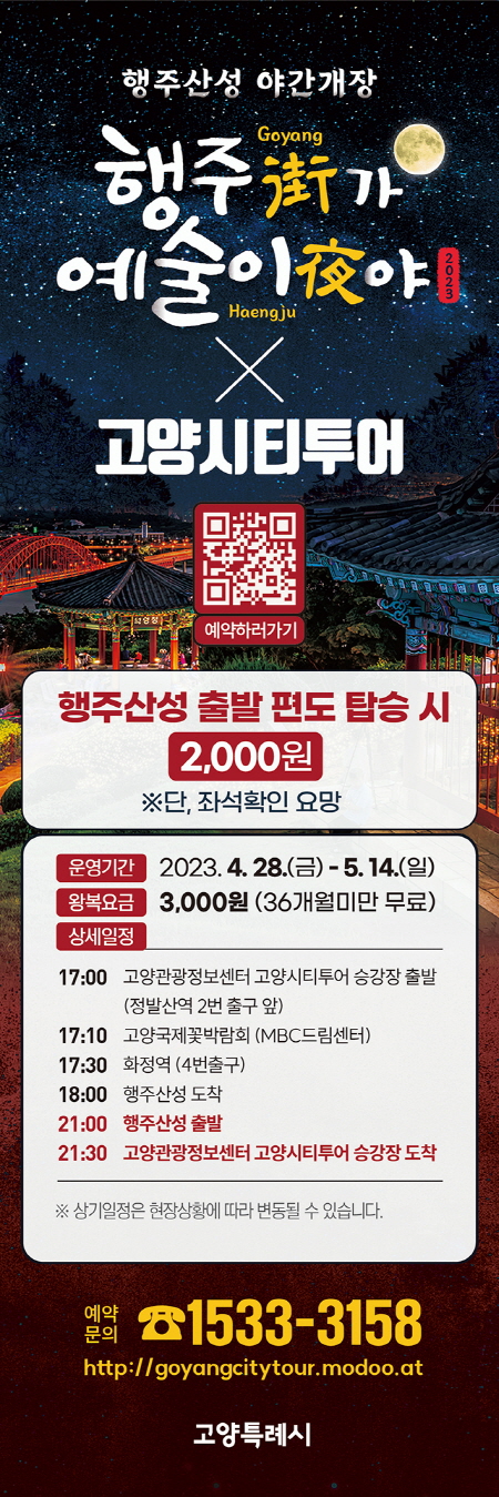 기간 중 시티투어 버스는 ▲오후 5시 정발산역 2번 출구 고양관광정보센터에서 출발해 ▲고양국제꽃박람회장(MBC일산드림센터 빨간 조형물 앞) 앞을 지나 ▲화정역을 거쳐 ▲오후 6시에 행주산성에 도착한다. 참가자들은 ‘행주가(街) 예술이야(夜)’를 즐긴 후 ▲오후 9시에 행주산성에서 다시 출발하는 시티투어 버스에 올라 ▲오후 9시 30분 고양관광정보센터로 되돌아오게 된다.