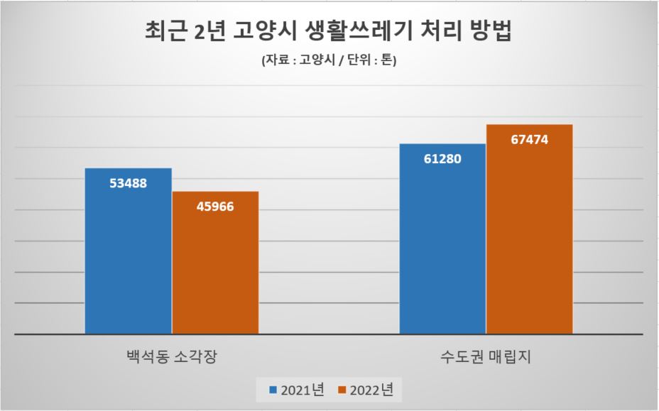 현재 가동 중인 백석동 쓰레기소각장은 1년 중에 가동일수가 250여일에 머물러 있으며, 1일 평균 소각량도 약 180여 톤에 불과하다. 시는 백석동소각장에서 하루 평균 180톤의 쓰레기만 소각하고 나머지 쓰레기는 인천 수도권매립지로 보내 해결하고 있다. 시에 따르면 작년 고양에서 발생한 종량제 생활폐기물 11만3440톤 중에 백석동소각장에서 처리한 것이 4만5966톤이고 나머지 6만7474톤은 인천으로 보내 매립했다. 그 전해인 2021년에는 11만4768톤 중에 5만3488톤은 백석동소각장에서 처리했고, 6만1280톤은 인천으로 보냈다.