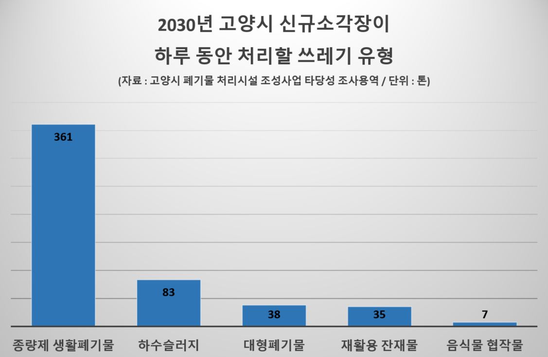 시는 새로 계획하는 쓰레기소각장의 1일 소각량을 630톤으로 설계하고 있지만, 실제로 2030년 고양시 예측인구 114만여명(창릉 계획인구 제외) 기준으로 1일 524톤이 발생할 것으로 예측하고 있다. 524톤에는 종량제 생활폐기물뿐만 아니라 음식물 협작물, 하수슬러지, 대형폐기물도 포함한 양이다. 예측되는 524톤을 세부적으로 구분하면 △종량제 생활폐기물 361톤 △재활용 잔재물 35톤 △음식물 협작물 7톤 △대형폐기물 38톤 △하수슬러지 83톤 등이다.