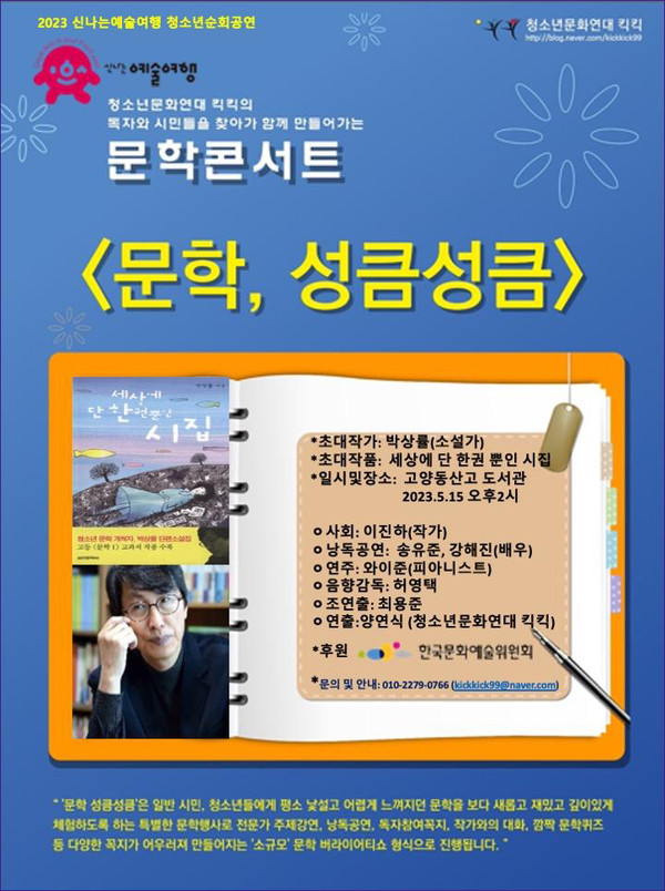 청소년문화연대 킥킥이 기획과 연출을 맡아 지난 2015년부터 전국 180곳이 넘는 곳에서 진행해온 ‘독자들을 직접 찾아가 그들과 함께 만들어가는 특별한 문학콘서트’ <문학 성큼성큼>이 한국문화예술위원회의 2023 신나는 예술여행 중고등학교 순회프로그램 중 하나로 선정돼 올해 전국 15개 중고등학교를 찾는다. 그 첫 번째 행사가 오는 5월 15일(월) 오후 2시 덕양구에 위치한 고양동산고 도서관에서 열린다. 초대 작품은 박상률 작가의 청소년소설 ‘세상에 단 한권뿐인 시집’이다.