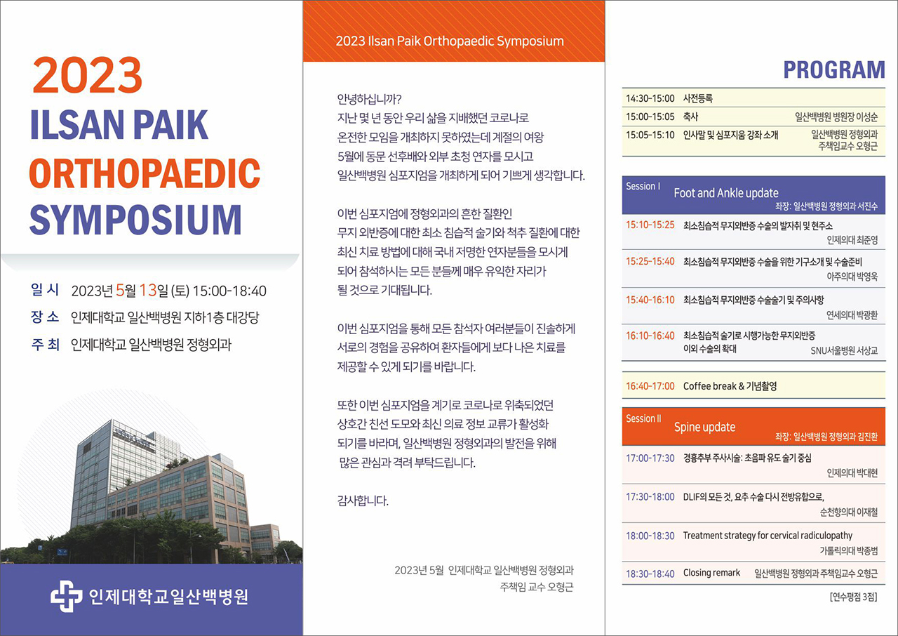[고양신문] 인제대학교 일산백병원이 13일 오후 3시부터 병원 대강당에서 ‘2023 일산백병원 정형외과 심포지엄’을 개최한다.