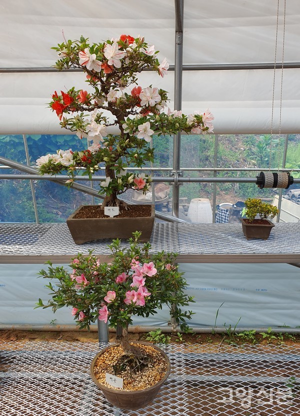 내년 90세를 앞두고 있는 박 대표의 손길로 만들어진 철쭉 중에서 ‘수광관’은 분재 와이어로 수형을 잡아서 연근처럼 뿌리가 밑에서 옆으로 내렸고, 위로 올라간 것은 가지가 됐다. ‘좀마삭’은 한 줄기에 잡힌 수형으로 무려 13개의 꽃머리가 생겨났으며, 수광관과 좀마삭은 박 대표의 솜씨로 진귀한 작품으로 탄생했다.
