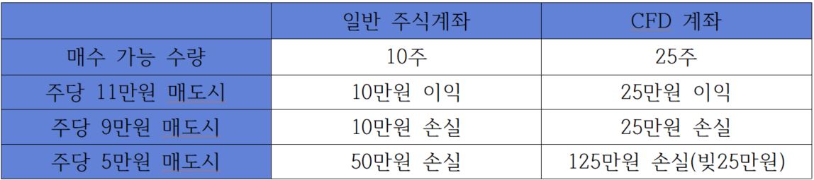 그럼 CFD는 좋은 점만 있는 건가요? 그럴리가요. 전에도 말씀드렸지만 세상에 공짜 점심은 없는 거죠. 증권사가 자기에게 이득이 없는 상품을 판매할 리가 있나요. 증권사는 주식투자에 따른 손익은 아무 상관없이 투자자에게 신용을 빌려준 대가로 수수료를 받습니다. 쉽게 생각하면 투자자가 투자규모를 늘릴 수 있도록 돈을 빌려준 거랑 같습니다. 투자자는 가진 투자금에 비해 훨씬 큰 규모의 투자를 할 수 있는 장점이 있지만 투자 실패 시에는 손실규모가 엄청나게 확대될 수 있습니다. 위의 예처럼 100만원으로 현재 주가 10만원짜리 삼성전자 주식에 투자하는 경우 투자손익을 한번 비교해 보겠습니다.