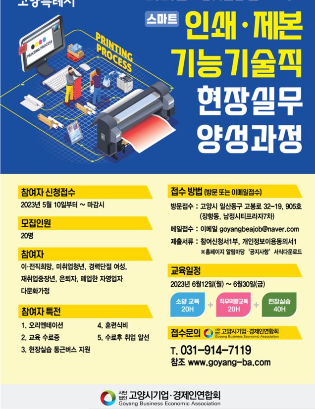 (사)고양시기업·경제인연합회는 이·전직 중장년층, 미취업 청년, 경력단절 여성, 폐업한 자영업자의 재취업을 통해 고양시 인쇄·문화 융합 집적지 육성 계획에 맞춘 장항동 내 인쇄특화산업의 활성화로 선순환적 일자리 창출을 목적으로 참여자를 모집 중이다.