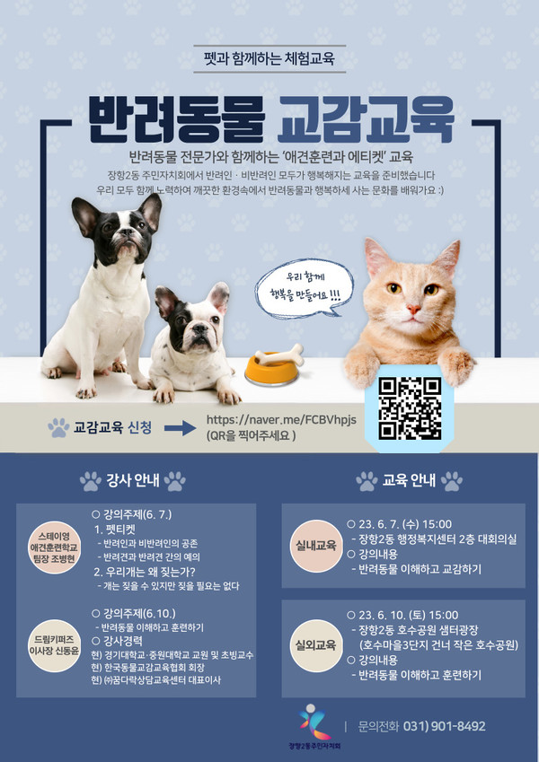 1차 실내교육은 6월 7일 15시 장항2동 행정복지센터에서 ‘펫티켓과 우리 개는 왜 짖는가?’라는 주제로 진행된다. 2차 실외교육은 6월 10일 오후 3시 일산호수공원 샘터광장에서 ‘아름다운 동행, 함께하는 산책교육과 반려견의 사회성’을 주제로 열린다.