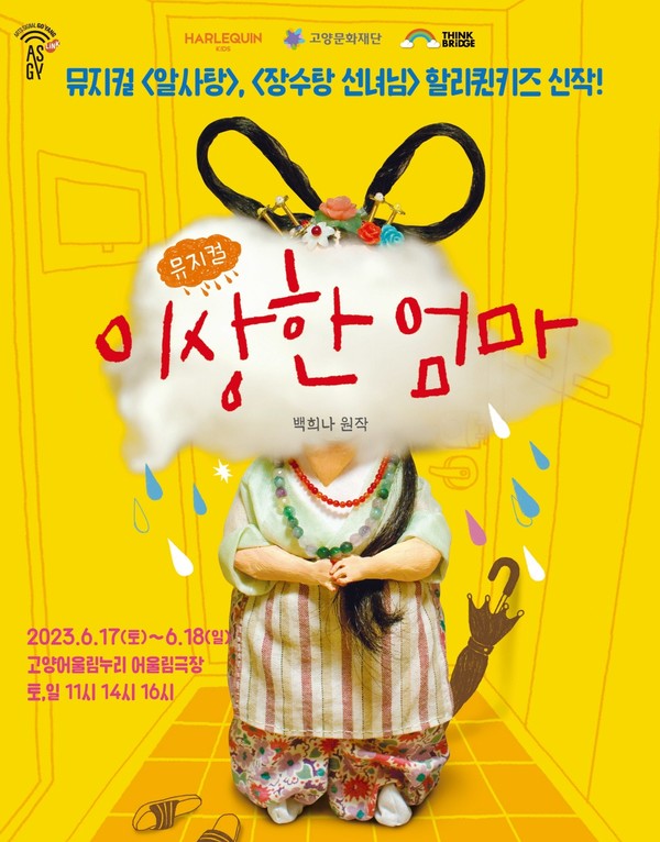 [고양신문] 고양문화재단이 ‘2023 패밀리 초이스’ 두 번째 프로그램으로 가족 뮤지컬 <이상한 엄마>를 17일과 18일 고양어울림누리 어울림극장에서 선보인다. 아동문학계를 대표하는 베스트셀러 작가인 백희나 작가의 동명 작품을 원작으로 한 <이상한 엄마>는 동화책과 뮤지컬 모두 큰 인기를 얻은 <알사탕>, <장수탕 선녀님>에 이어 할리퀸키즈 시리즈의 세 번째 작품으로 선보이는 가족 뮤지컬이다.