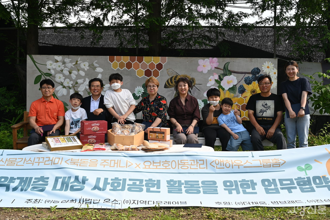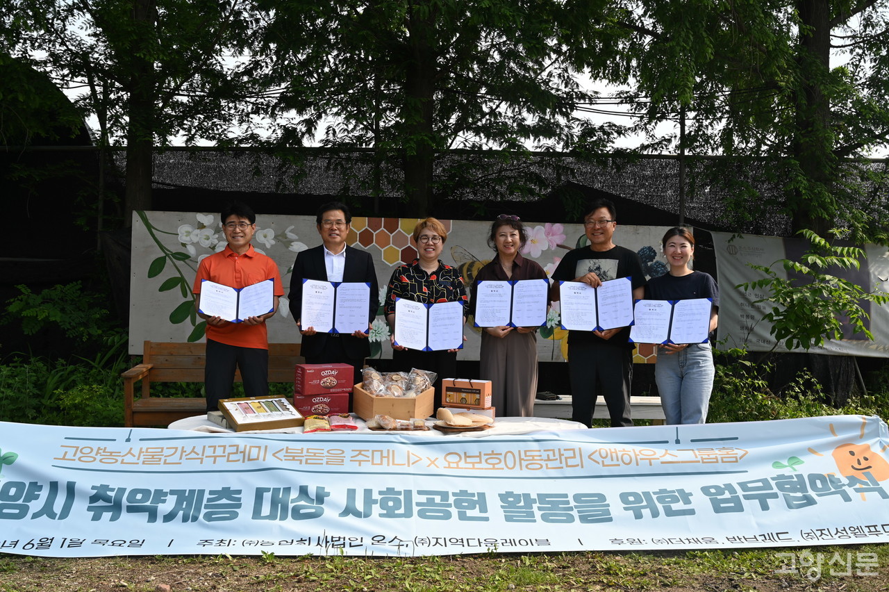 [고양신문] 고양시 소재 아동복지시설인 앤하우스 그룹홈 후원을 위해 지역기업들이 힘을 합쳤다. 식품제조 및 납품업체인 ㈜농업회사법인 온스, ㈜지역다운레이블, 밥브레드, ㈜더채움, ㈜진성웰푸드 등 6개 기업과 앤하우스 그룹홈은 1일 허니순 꿀벌농장에서 ‘취약계층 사회공헌 활동을 위한 업무협약’을 체결했다.