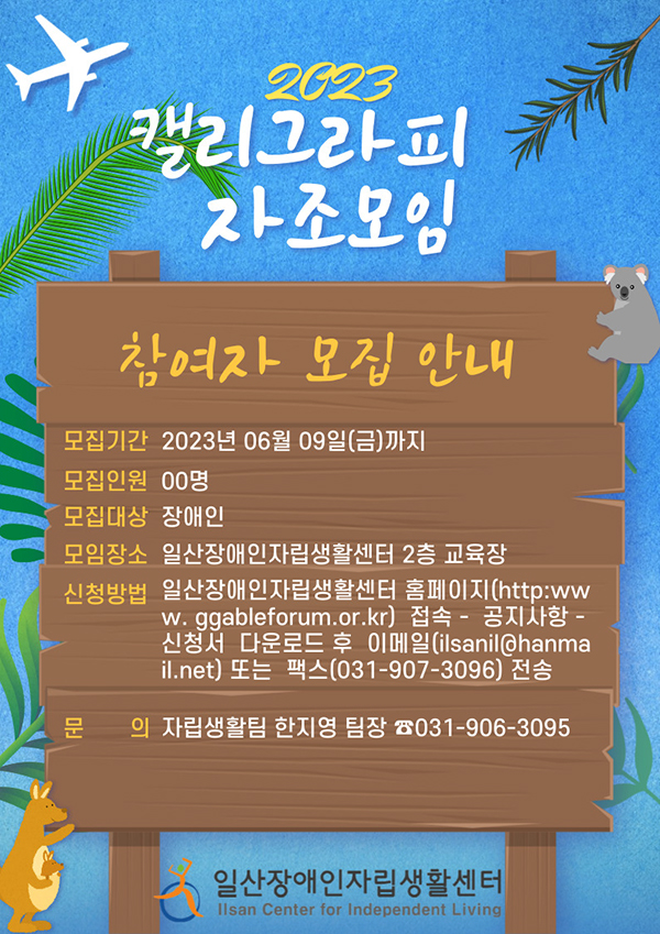 [고양신문] 일산장애인자립생활센터(대표 김재룡)가 중증장애인이 지역사회에서 안정적인 자립생활을 할 수 있도록 지원하고 일상생활에 활기를 불어넣고자 캘리그라피 자조모임 참여자를 9일까지 모집한다.