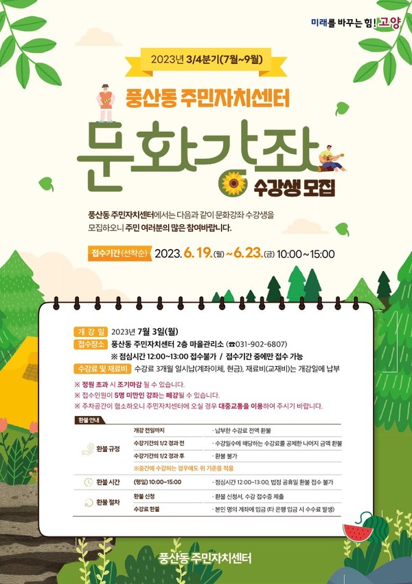 풍산동 주민자치센터 문화강좌 프로그램 접수는 6월 19일부터 23일까지 매일 오전 10시부터 오후 3시까지(12시~1시 제외) 주민자치센터 2층 마을관리소에서 진행되며, 자세한 내용은 고양시청 홈페이지 내 풍산동 페이지에서 확인이 가능하다.