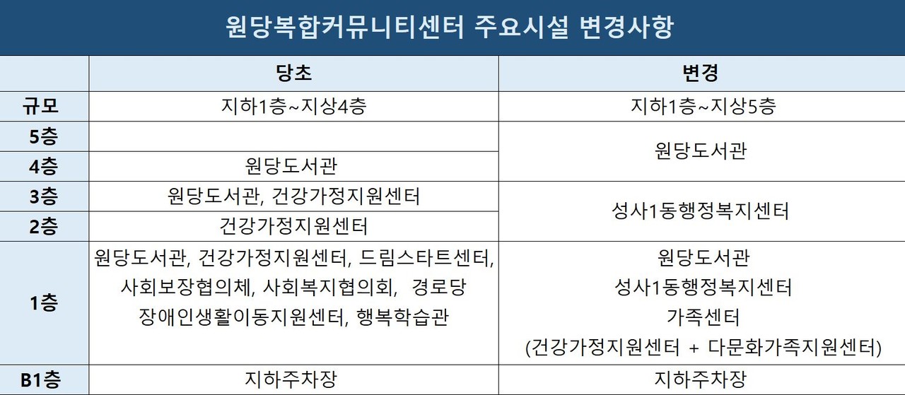 당초 원당복합커뮤니티센터 건립 사업은 2021년 정부의 생활SOC복합화 사업에 선정되면서 추진됐다. 생활SOC란 보육·의료·복지·교통·문화·체육시설 등 일상생활에서 시민의 편익을 증진시키는 모든 시설을 뜻한다. 원당복합커뮤니티센터 건립사업은 국도비 65억원, 시비183억원을 합친 248억원이 소요되는 사업으로, 내년 7월 시설공사를 추진해 2026년 6월 개관될 예정이다. 지하1층~지상 5층 규모의 원당복합커뮤니티센터 1층은 가족센터, 2층과 3층은 성사1동행정복지센터. 4층과 5층은 원당4구역 주택재개발정비사업로 철거된 원당도서관이 이전해 새롭게 둥지를 튼다.
