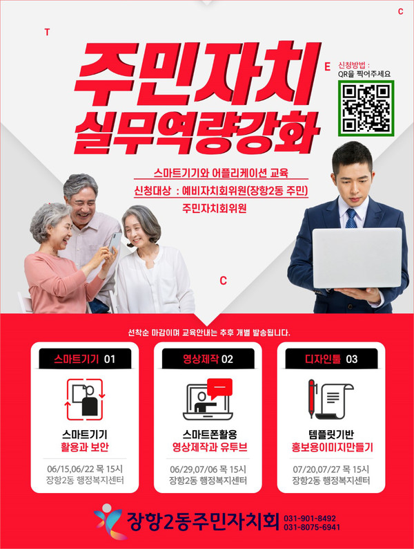 장항2동 주민자치회가 오는 6월 15일부터 주민자치회위원과 예비주민자치위원들을 위한 ‘자치역량 강화교육’을 한다. ‘자치역량 강화교육’은 6월 15일 목요일을 시작으로, 매주 목요일 15시마다 총 6회에 걸쳐 운영된다. ▲ 6월 15일, 22일에 스마트기기(활용과 보안) ▲ 6월 29일, 7월 6일에 스마트폰활용(영상제작과 유튜브) ▲ 7월 20일, 27일에 템플릿을 기반으로 하는 홍보용 이미지 만들기를 주제로 진행된다.