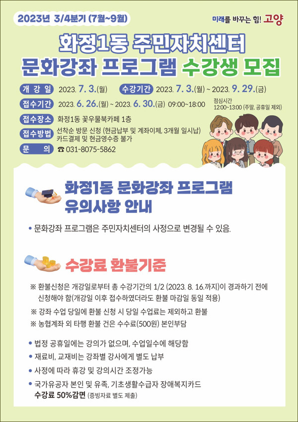 화정1동 주민자치회가 오는 7월 3일부터 9월 29일까지 3개월 과정의 2023년도 3분기 주민자치센터 문화강좌 프로그램을 운영한다. 수강신청은 6월 26일부터 6월 30일까지(평일 9시~18시, 12시~13시 점심시간 제외) 화정1동 행정복지센터 옆 꽃우물 북카페에서 선착순으로 진행된다.