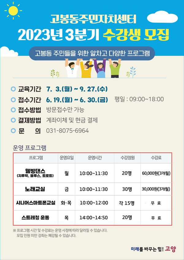 수강 신청은 6월 19일부터 30일까지(점심시간 12시~13시 제외) 고봉동 행정복지센터 2층 주민쉼터(북카페)로 방문 접수하며, 선착순으로 신청이 가능하다.