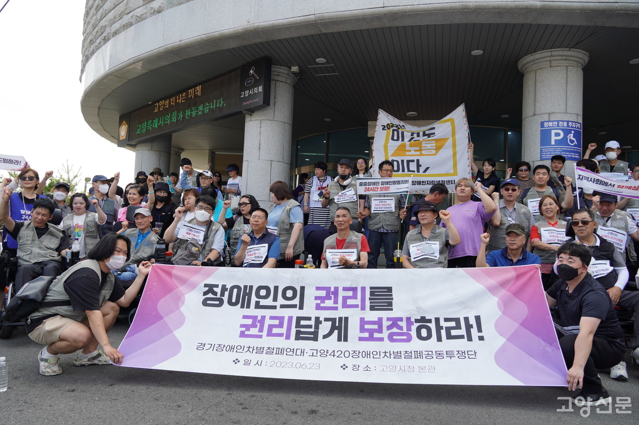 [고양신문] 지난 23일 고양시청 시의회 건물 앞에서 고양시 장애인 권리보장을 위한 고양420장애인차별철폐공동투쟁단의 결의대회가 열렸다. 경기420장애인차별철폐공동투쟁단(이하 경기420공투단)이 주관한 이번 대회에는 아람장애인자립생활센터, 경기장애인부모연대 고양시지부, 햇빛촌장애인자립생활센터가 발언에 참여했다.