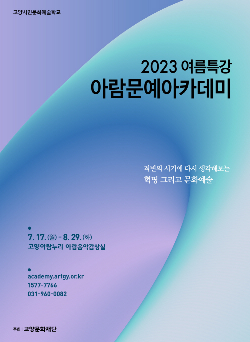 [고양신문] 고양아람누리 문화예술 교육프로그램 ‘2023 여름특강 아람문예아카데미’가 7월 17일(월)부터 8월 29일(화)까지 6주간 진행된다. 고양문화재단 관계자는 “엔데믹 시대의 개막, 러시아-우크라이나 전쟁에 이은 세계 패권 전쟁, 챗GPT와 같은 기술 혁신의 가속화 등 격변의 시기에 ‘혁명 그리고 문화예술’을 다시 생각해보는 콘셉트로 프로그램을 기획했다”고 설명했다. 이번 여름특강에선 클래식음악, 재즈, 뮤지컬, 미술, 철학, 역사 등 총 12개의 프로그램이 시민들을 맞이한다.