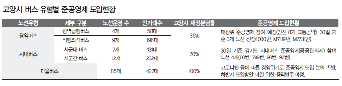 고양시의 경우 작년 기준 마을버스 운영지원에 약 93억원을 지원했으며 올해 운영난 여파로 재정지원 규모는 더욱 커질 것으로 예상된다. 또한 수도권 환승할인에 따른 손실지원금 또한 연간 100억원에 달하는 등 이미 상당한 예산을 버스운영에 투입하고 있다. 하지만 정작 버스운영체계는 민영제에 기반한 까닭에 버스노선 개편·조정을 위한 실질적 권한은 행사하지 못하는 상황이다.